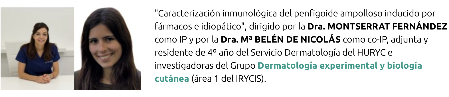 Esta linea interna del Irycis ayuda a los investigadores emergentes a desarrollar proyectos de investigación. En nuestro caso acudiamos a la Convocatoria General de Proyectos de Investigación por nuestro proyecto titulado:»Caracterización inmunológica del penfigoide ampolloso inducido por fármacos e idiopático». En este proyecto he tenido el apoyo del Servicio de Alergología, de Inmunología, de Anatomía Patológica y del Laboratorio del Profesor Javier Martínez Botas. Sin ellos y el trabajo en equipo no lo podríamos haber solicitado, y pone en relevancia que los Proyectos de Investigación en grupo, multidisciplinares, aunando clínicos de diferentes especialidades, con investigadores de ciencias básicas son la forma de trabajo ideal para la investigación de enfermedades. La Dra Belén de Nicolas, con la que comparto la responsabilidad de los Proyectos de Investigación es una excelente residente de dermatología de cuarto año, que esta realizando su Tesis Doctoral sobre el Penfigoide Ampolloso.